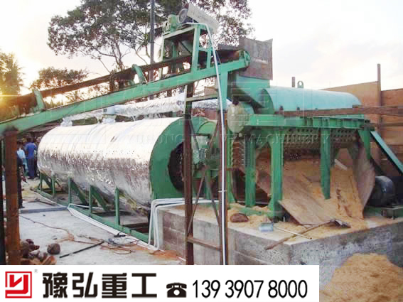 棕櫚絲烘干機(jī)主要包括進(jìn)料口、生熱爐、過(guò)濾筒、旋轉(zhuǎn)筒、物料輸送管、冷卻筒和出料口,旋轉(zhuǎn)筒位于主動(dòng)滾輪上,主動(dòng)滾輪靠電機(jī)及減速傳動(dòng)帶動(dòng)旋轉(zhuǎn)筒低速轉(zhuǎn)動(dòng),生熱爐與旋轉(zhuǎn)筒之間設(shè)有進(jìn)料口,旋轉(zhuǎn)筒內(nèi)設(shè)有翻炒葉片,在旋轉(zhuǎn)筒與過(guò)濾筒相連處設(shè)有擋板,擋板上開(kāi)有一小孔,過(guò)濾筒一端與旋轉(zhuǎn)筒相連。
